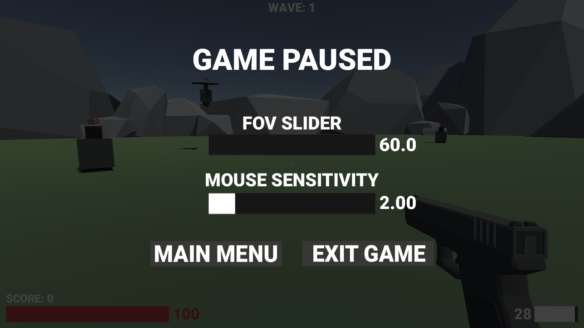 The main focus of the project was exploring AI behaviours and implementing basic Unity systems such as field of view sliders and mouse sensitivity settings.